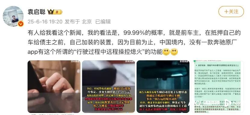 知名汽车KOL袁启聪分析认为,“99.99%的概率,就是前车主,在抵押自己的车给债主之前,自己加装的装置,因为目前为止,中国境内,没有一款奔驰原厂App有这个所谓的‘行驶过程中远程操控熄火’的功能。”